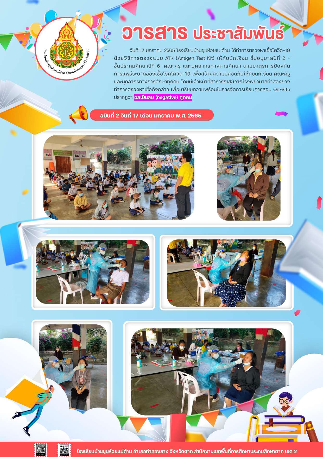 วันที่ 17 มกราคม 2565 โรงเรียนบ้านขุนห้วยแม่ต้าน ได้ทำการตรวจหาเชื้อโควิด-19 ด้วยวิธีการตรวจแบบ ATK (Antigen Test Kit) ให้กับนักเรียน ชั้นอนุบาลปีที่ 2 - ชั้นประถมศึกษาปีที่ 6 คณะครู และบุคลากรทางกา