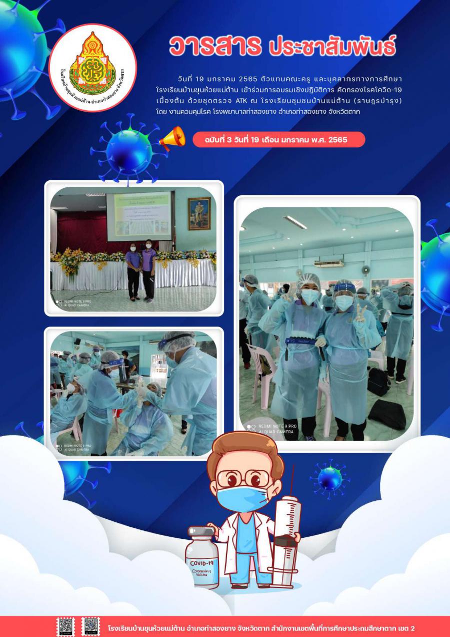 วันที่ 19 มกราคม 2565 ตัวแทนคณะครู และบุคลากรทางการศึกษา โรงเรียนบ้านขุนห้วยแม่ต้าน เข้าร่วมการอบรมเชิงปฏิบัติการ คัดกรองโรคโควิด?19 เบื้องต้น ด้วยชุดตรวจ ATK ณ โรงเรียนชุมชนบ้านแม่ต้าน (ราษฎรบำรุง)